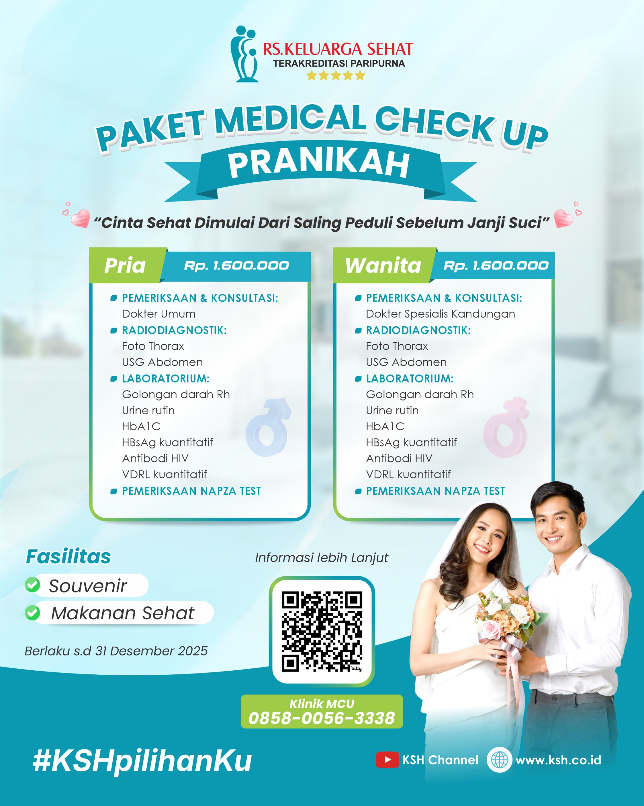 Yuk, manfaatkan 𝗣𝗔𝗞𝗘𝗧 𝗠𝗘𝗗𝗜𝗖𝗔𝗟 𝗖𝗛𝗘𝗖𝗞 𝗨𝗣 𝗣𝗥𝗔𝗡𝗜𝗞𝗔𝗛 di RS Keluarga Sehat yang meliputi :