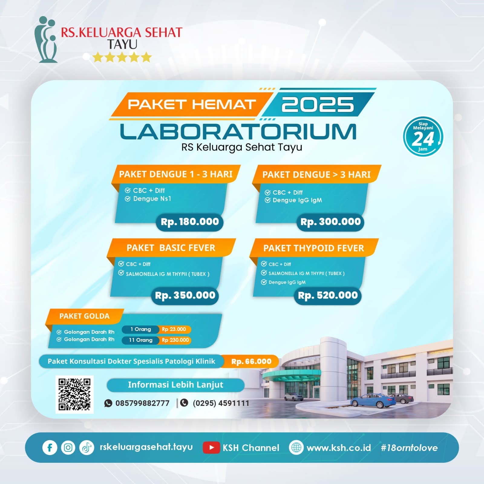 Jangan khawatirSobat Sehat dapat memanfaatkan 𝐏𝐚𝐤𝐞𝐭 𝐇𝐞𝐦𝐚𝐭 𝐋𝐚𝐛𝐨𝐫𝐚𝐭𝐨𝐫𝐢𝐮𝐦 𝐑𝐒 𝐊𝐞𝐥𝐮𝐚𝐫𝐠𝐚 𝐒𝐞𝐡𝐚𝐭 𝐓𝐚𝐲𝐮 yang berlaku sampai 𝟑𝟏 𝐃𝐞𝐬𝐞𝐦𝐛𝐞𝐫 𝟐𝟎𝟐𝟓. Yuk, simak infografis berikut untuk layanan Paket Hemat Laboratorium RS Keluarga Sehat 2025.