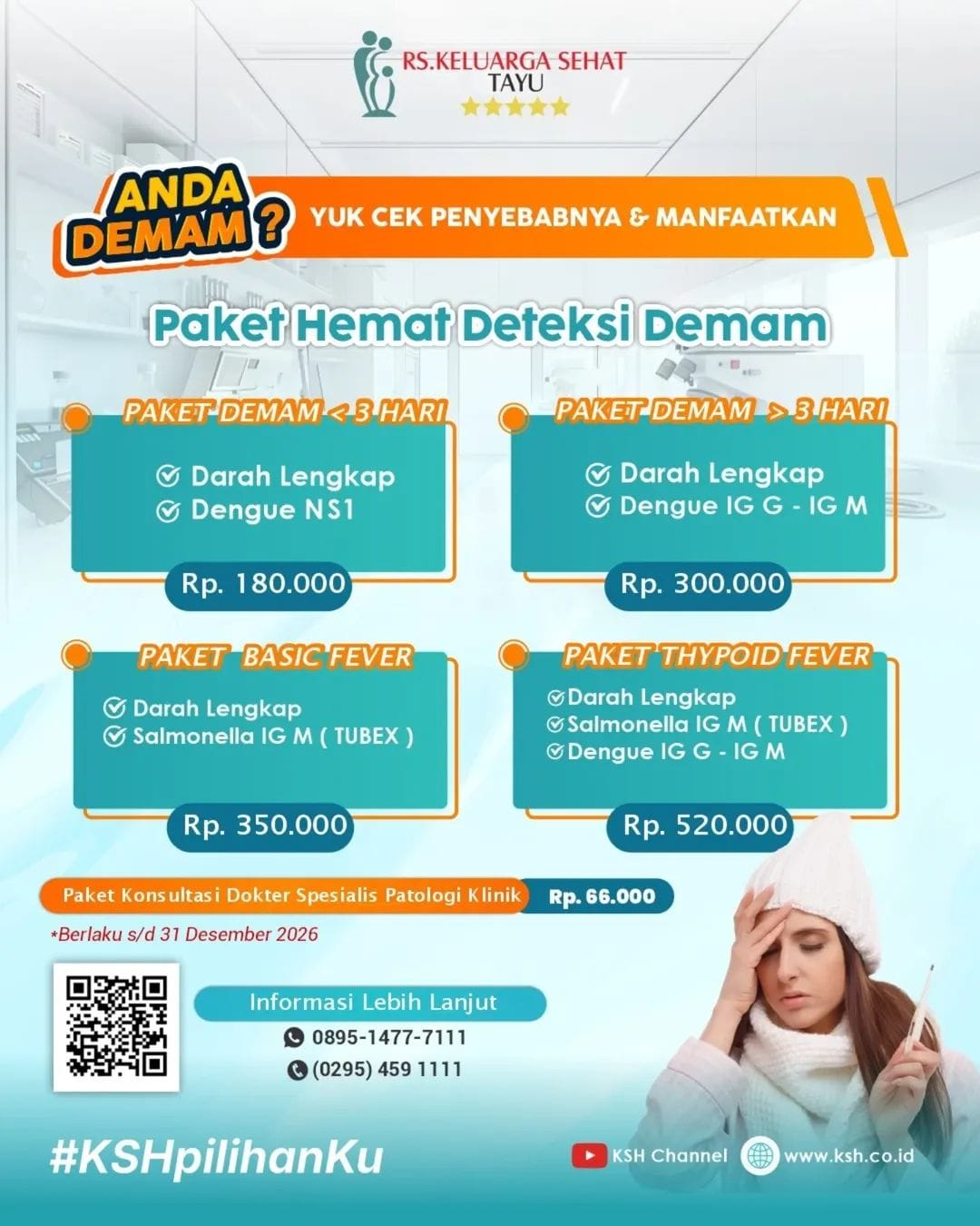 Tersedia berbagai pilihan paket pemeriksaan yang disesuaikan dengan kebutuhan kesehatan, baik untuk pemantauan rutin, deteksi dini penyakit, maupun kontrol kondisi tertentu. Proses pemeriksaan cepat, nyaman, dan aman.